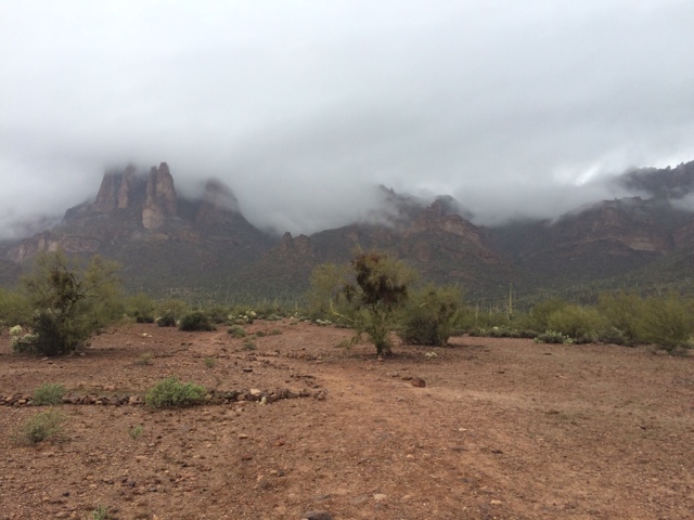 A little background, it's been cold (Arizona cold) for the past two months here. I blame El Nino for my higher than usual winter electric bills. The day we went hiking was really the only day that would work with our schedule and it wasn't the prettiest of days. It was overcast and a bit chilly, the first picture is actually the last picture. As we began our climb down from the cave it began to mist and the low clouds came in and made for a ominous picture.